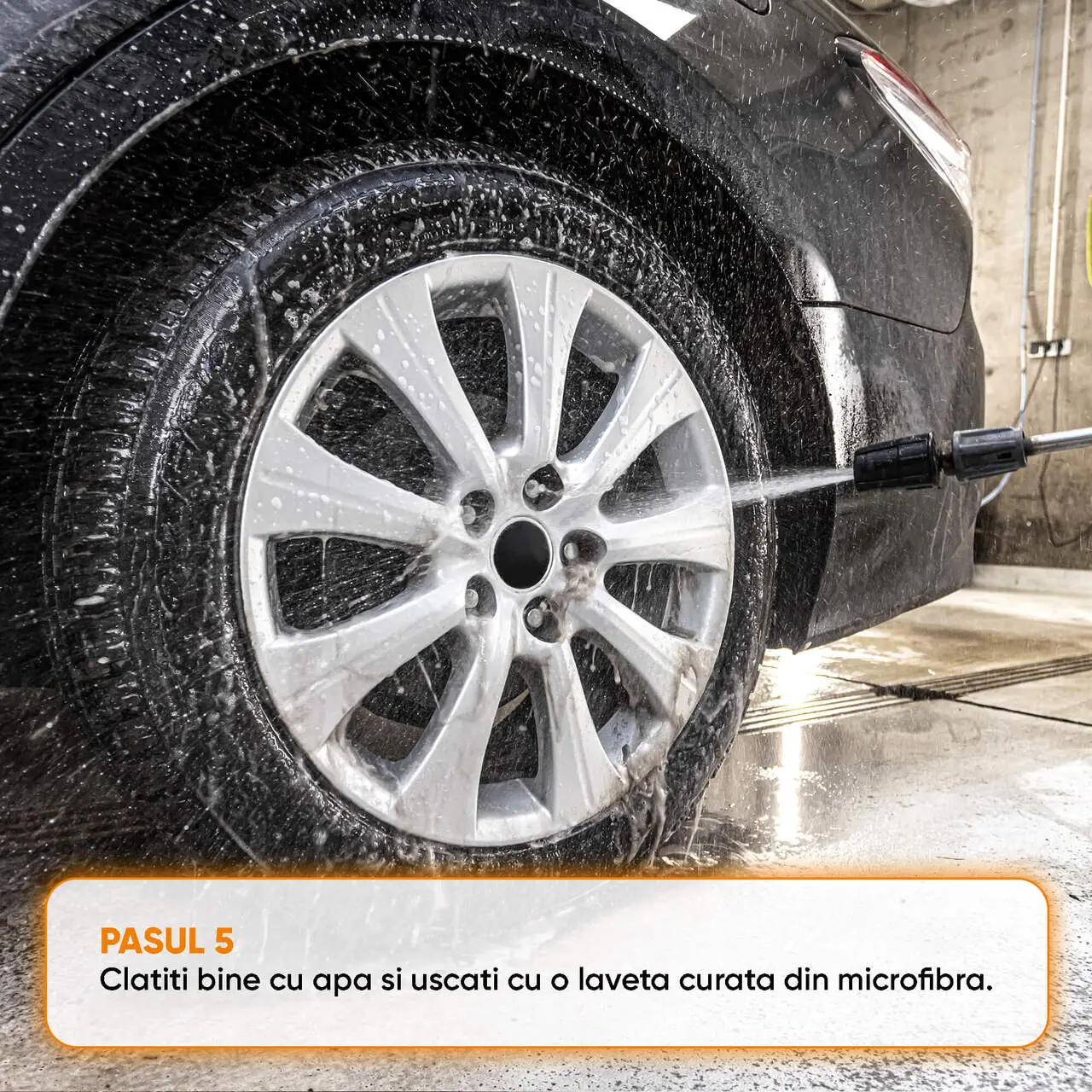 - Solutia nu doar degreseaza eficient, eliminand grasimea si reziduurile dificile, ci si formeaza un strat protector care impiedica murdaria sa se redepuna, mentinand jantele curate pentru mai mult timp.