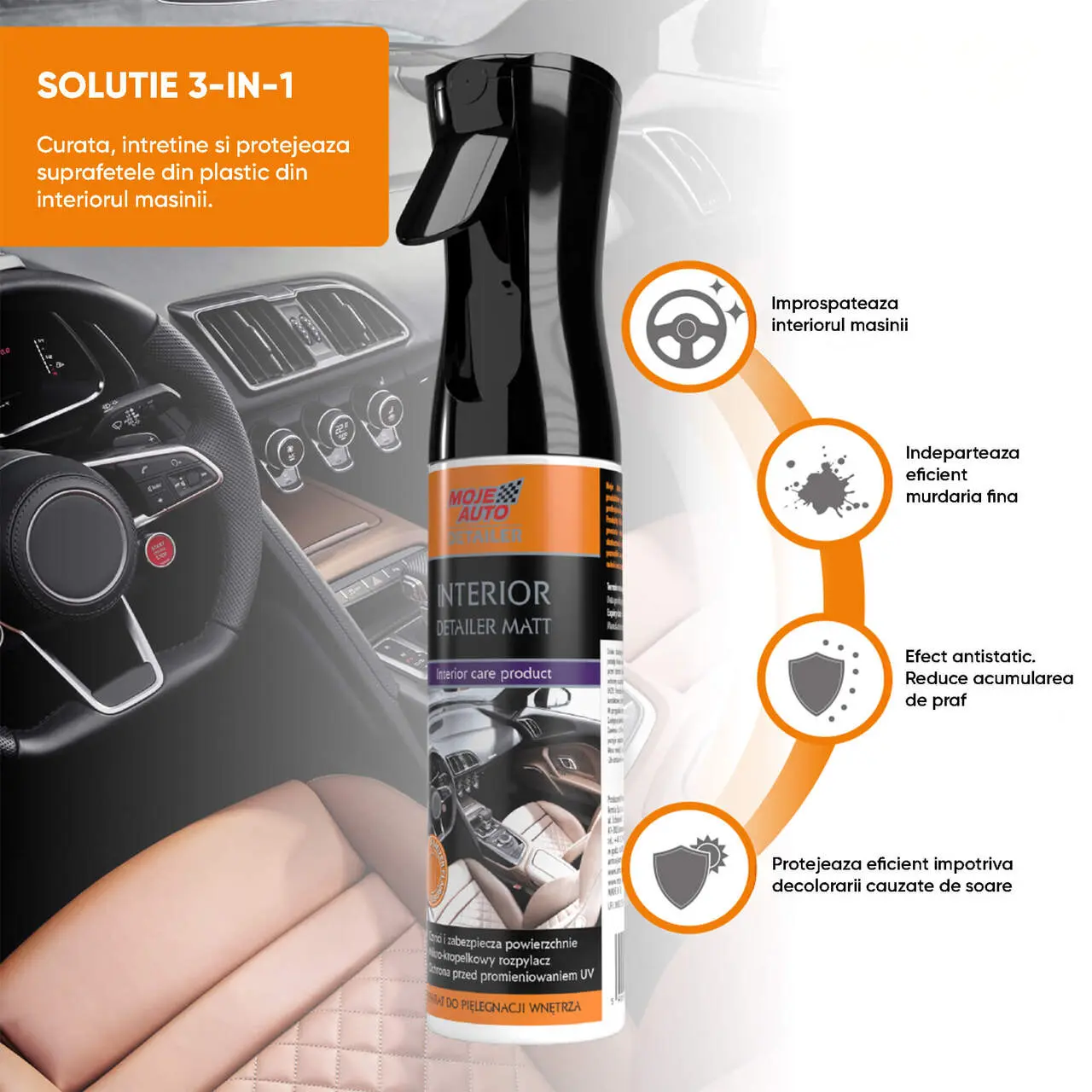 - Lasa un finish mat, fara urme sau aspect lucios. Ideal pentru un aspect ingrijit si curat al interiorului auto.
