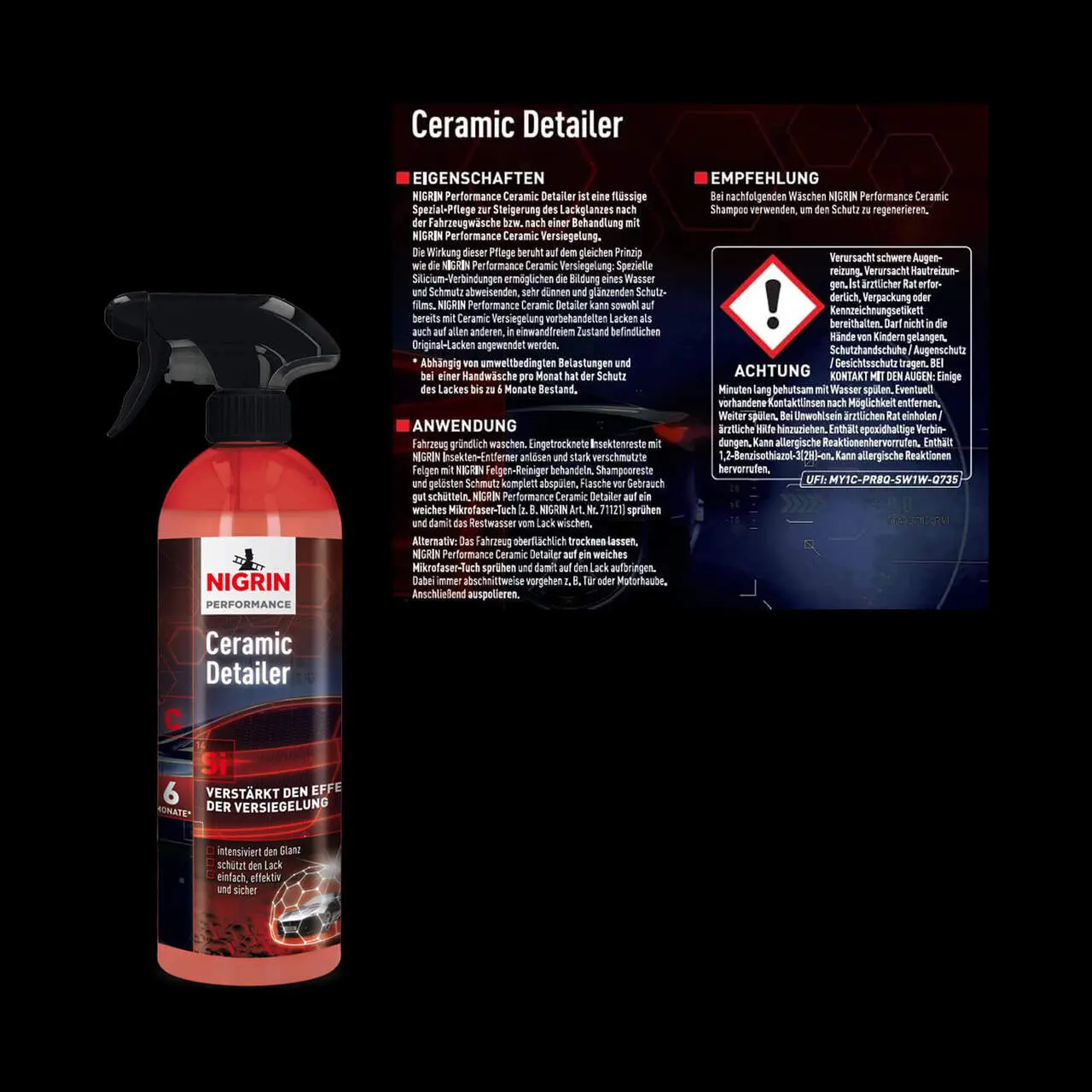 - NIGRIN Performance Ceramic Detailer este un produs special de ingrijire lichida care functioneaza folosind aceeasi tehnologie ca si etasantul ceramic.