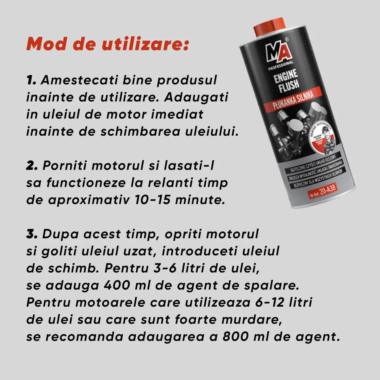 - Dupa acest timp, opriti motorul si goliti uleiul uzat, introduceti uleiul de schimb. Pentru 3-6 litri de ulei, se adauga 400 ml de agent de spalare. Pentru motoarele care utilizeaza 6-12 litri de ulei sau care sunt foarte murdare, se recomanda adaugarea a 800 ml de agent.