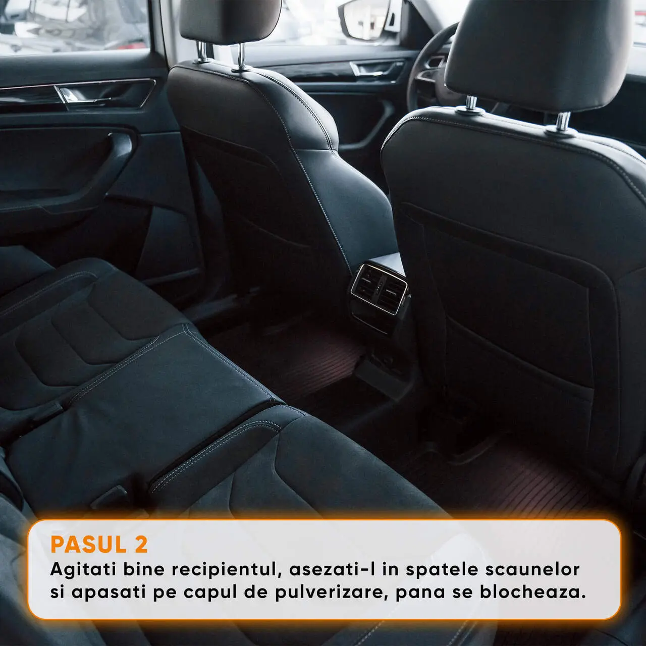- PASUL 2: Agitati bine recipientul. Asezati spray-ul vertical, in spatele scaunului soferului sau a pasagerului si apasati capul de pulverizare pana se blocheaza.