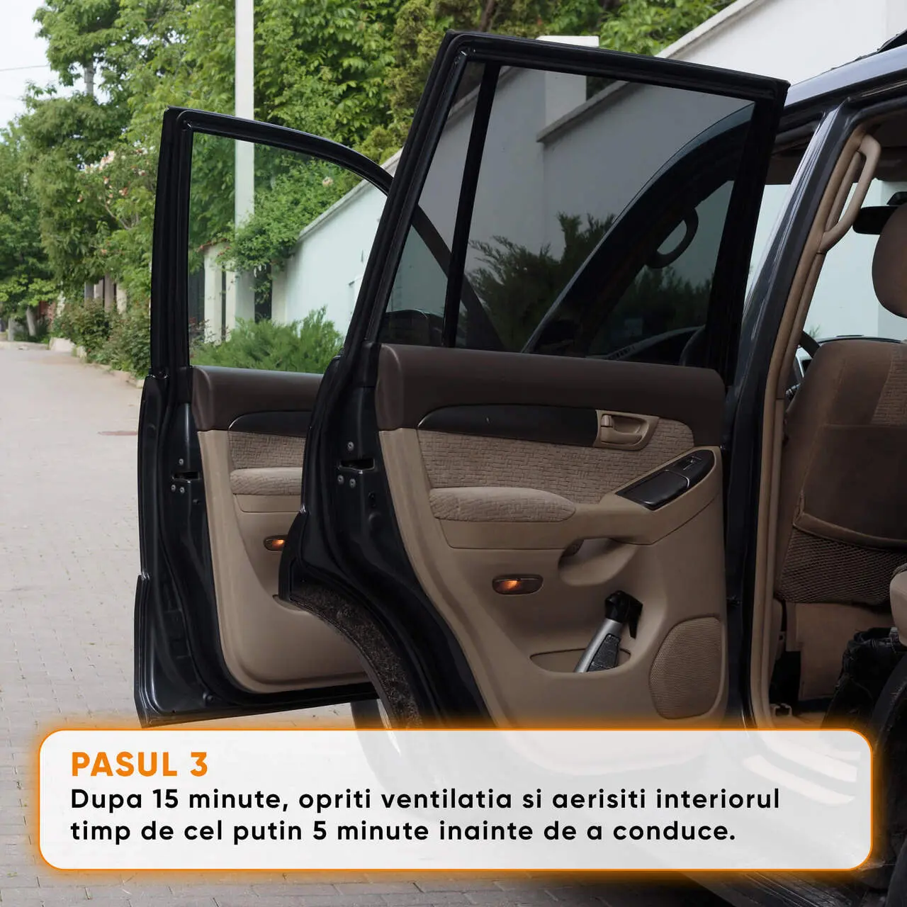 - PASUL 4: Dupa 15 minute, opriti ventilatia si aerisiti interiorul masinii timp de cel putin 5 minute inainte de a conduce.