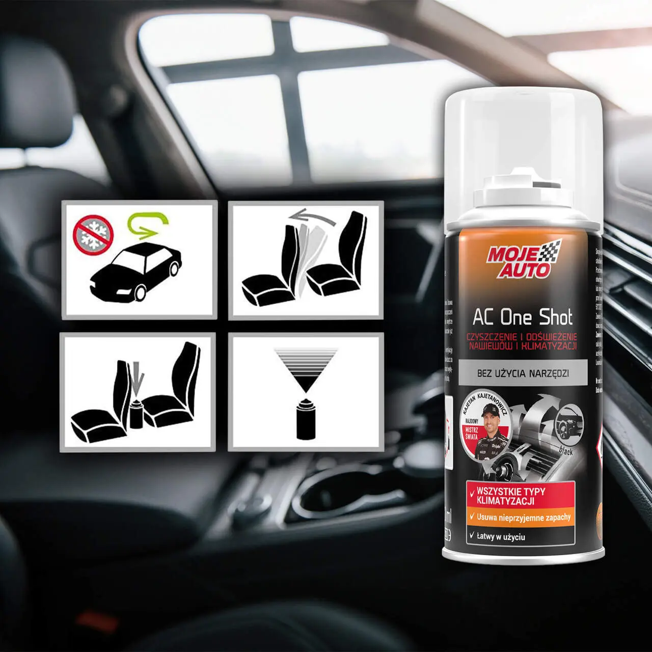 - Moje Auto AC ONE SHOT este un spray special conceput pentru improspatarea si curatarea sistemelor de aer conditionat si a gurilor de ventilatie auto.