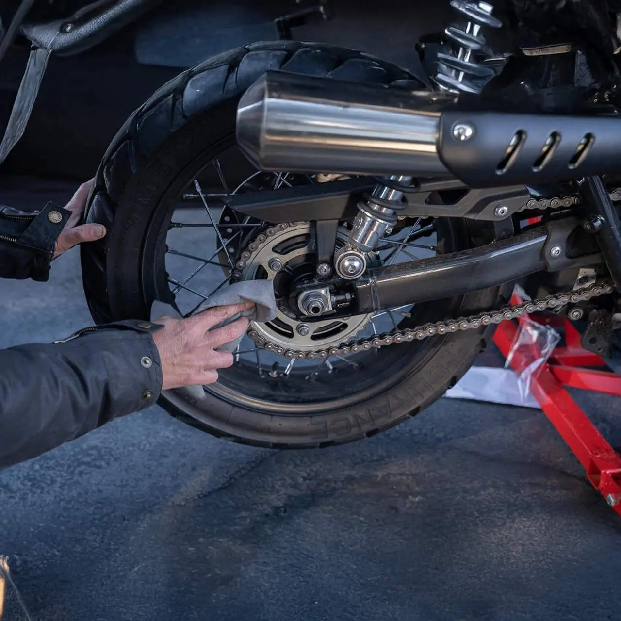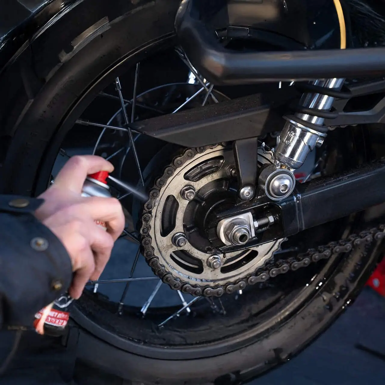 - La final, aplicati Spray lubrifiere lant motocicleta cu aplicator, Nigrin Moto-Bike, 400 ml pentru lubrifierea necesara.