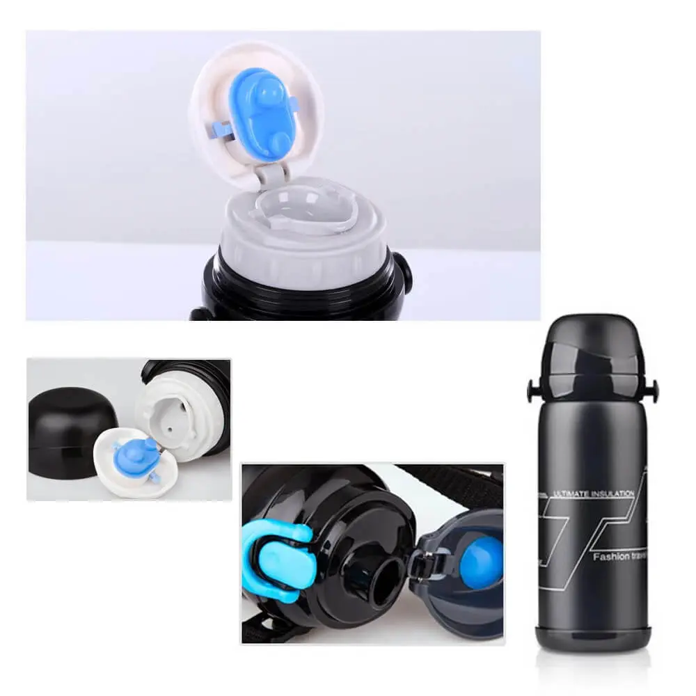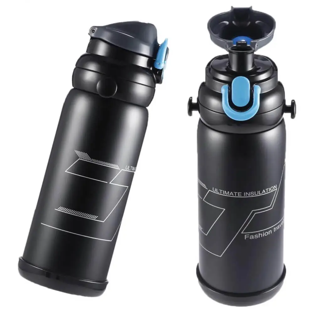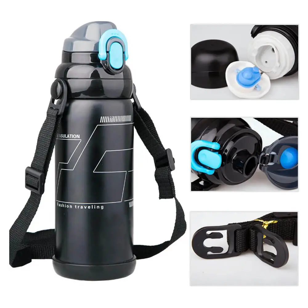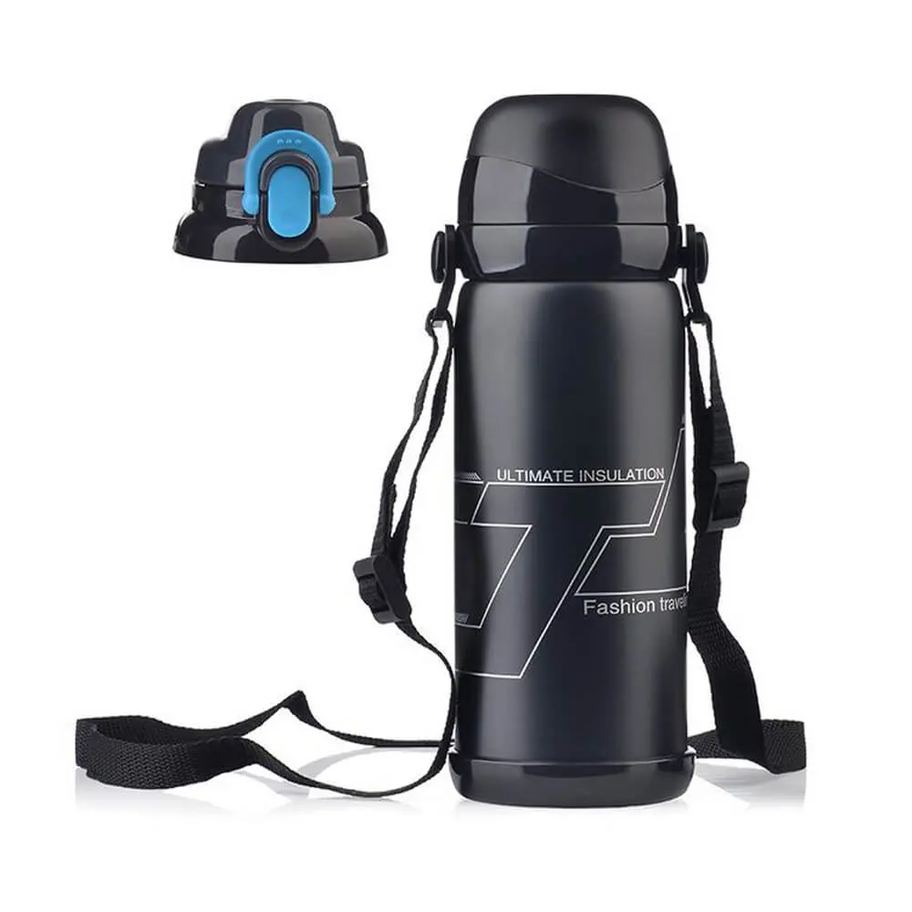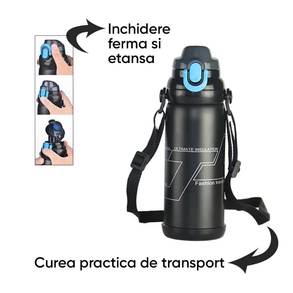 Sticla de apa 800 ml portabila cu doua capete interschimbabile, curea transport, recipient termos pentru bauturi calde si reci, bidon de apa, pentru bicicleta, sport, drumetie, camping, inox