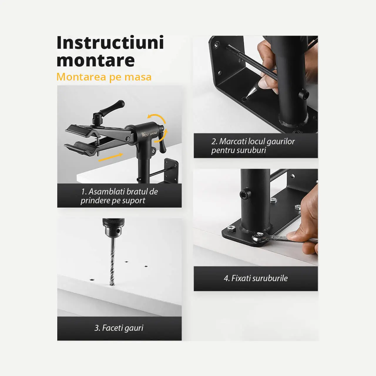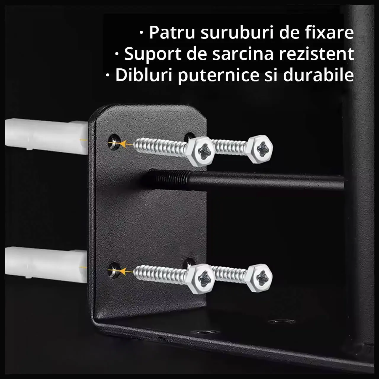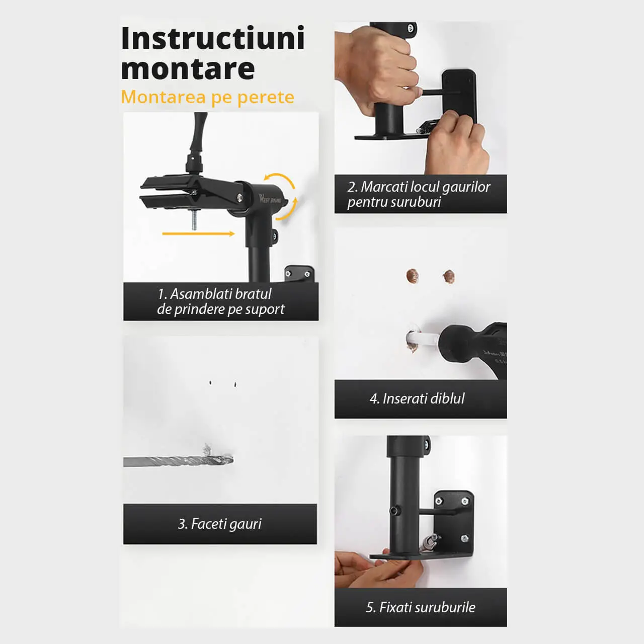 Cu sistemul sau de prindere reglabil, poti monta acest suport pe perete sau pe o masa, oferindu-ti flexibilitate maxima in organizarea spatiului tau.