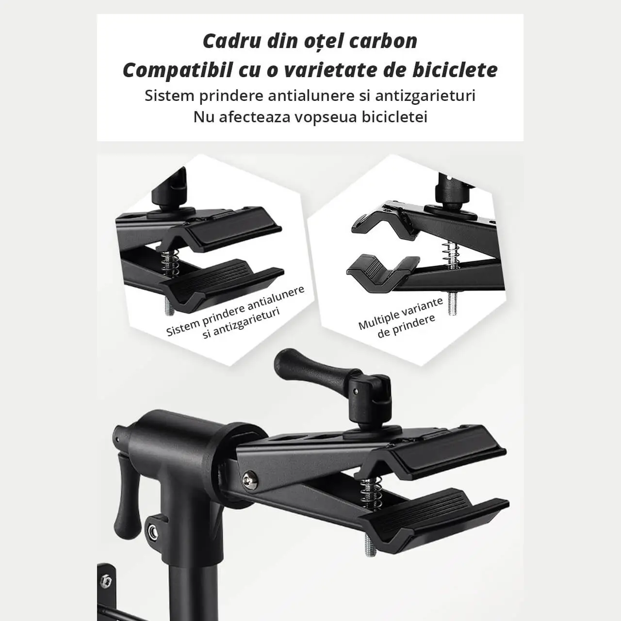 - Suportul 2 in 1 este profesional si extrem de robust, util atat pentru a depozita bicicleta cat si pentru repararea acesteia.