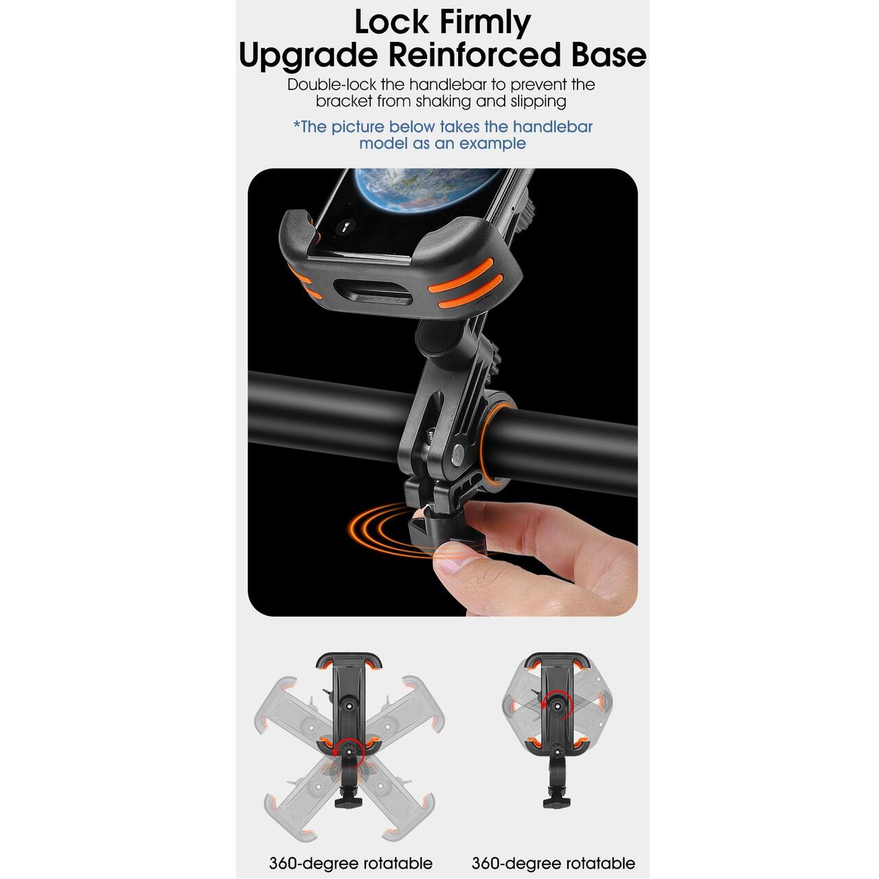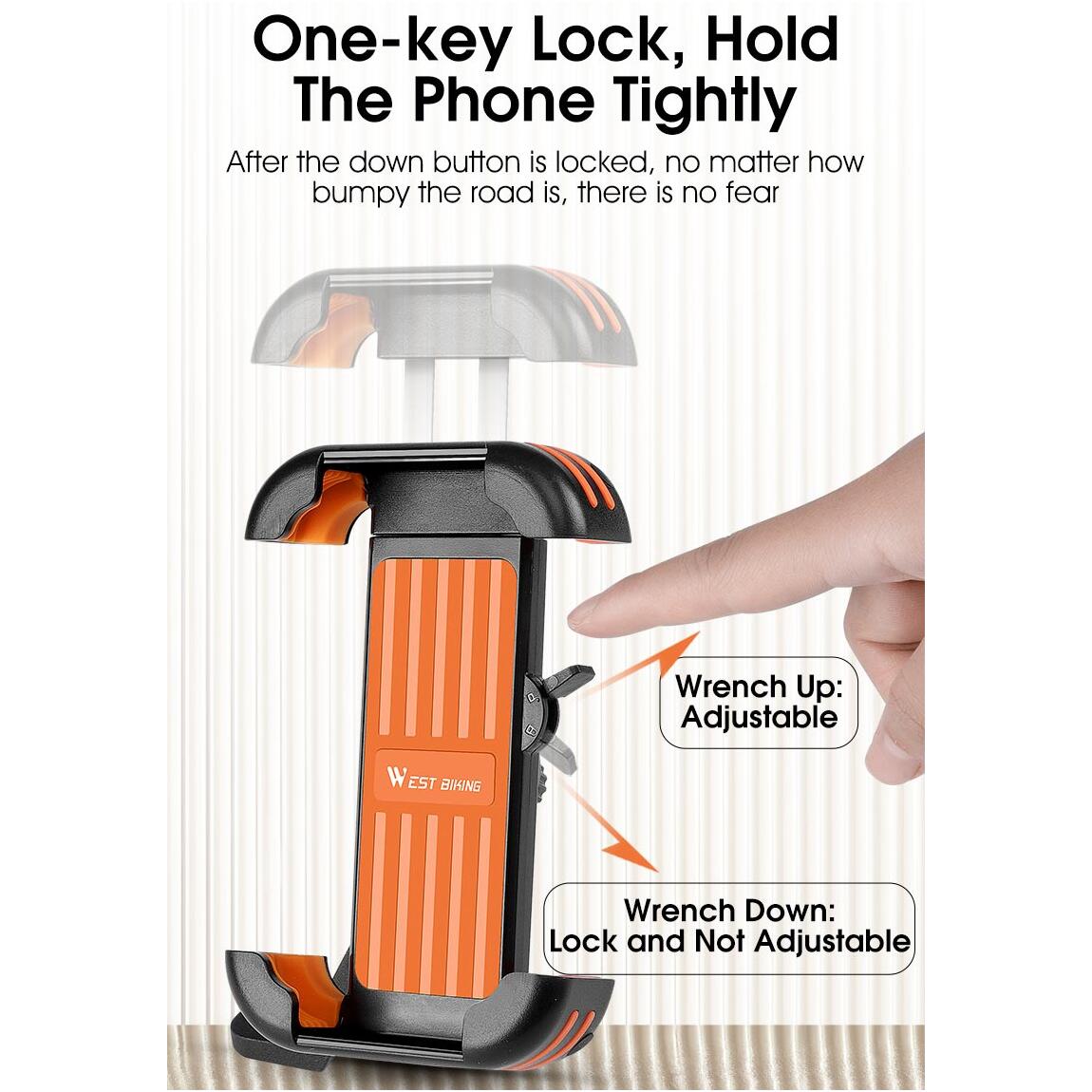 Suport telefon bicicleta, motocicleta, trotineta, scuter, bicicleta electrica, e-bike, MTB, reglare 360 de grade, antiderapant, antisoc, compatibil cu telefoane pana la 19 cm lungime, prindere ghidon, West Biking, 13.5 x 9 x 3.4 cm, negru cu portocaliu