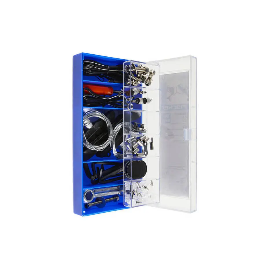 Trusa completa pentru reparatii biciclete, livrata intr-o cutie compacta din plastic dur. Contine 100 de piese esentiale pentru intretinerea si repararea bicicletelor.